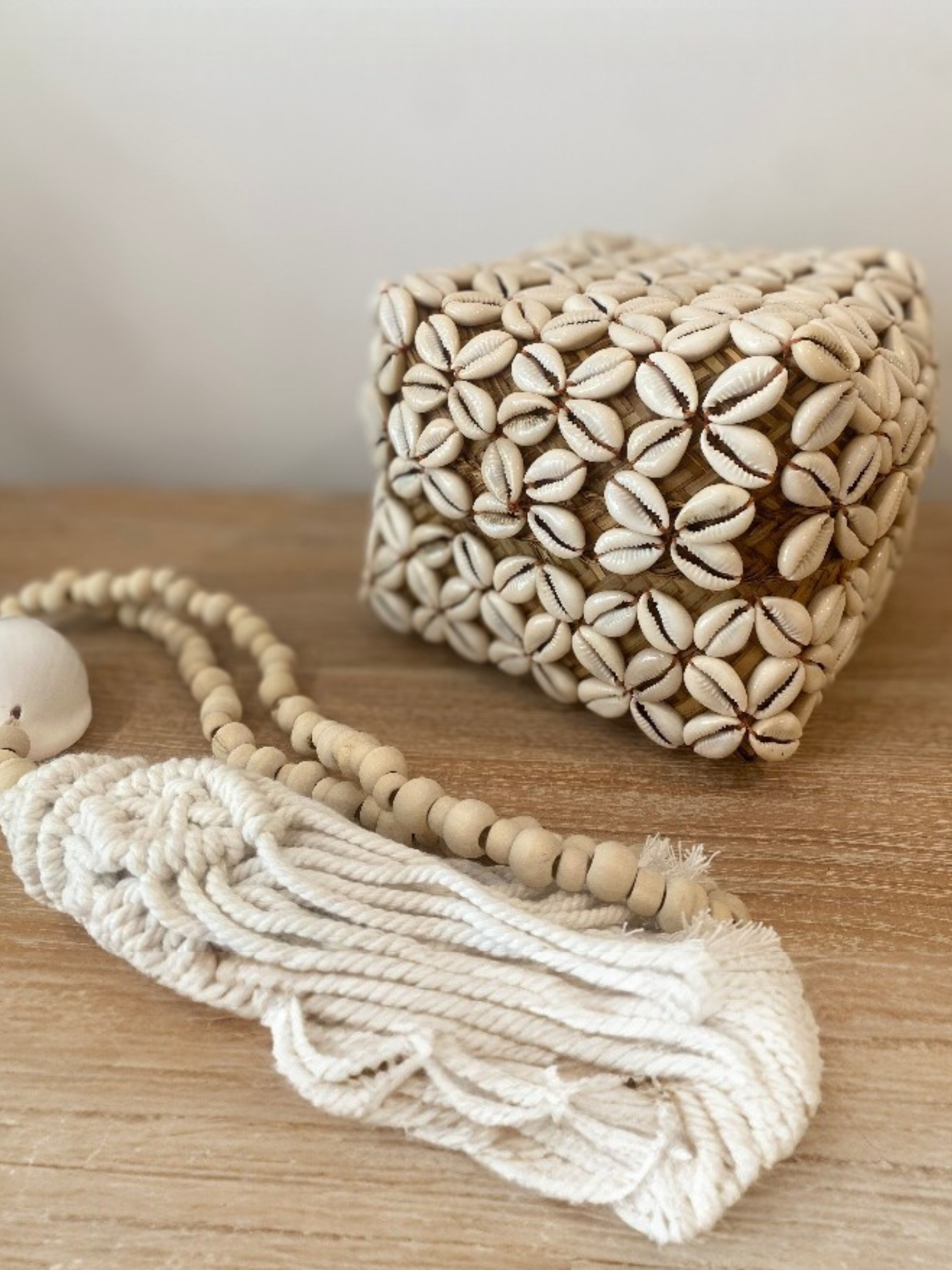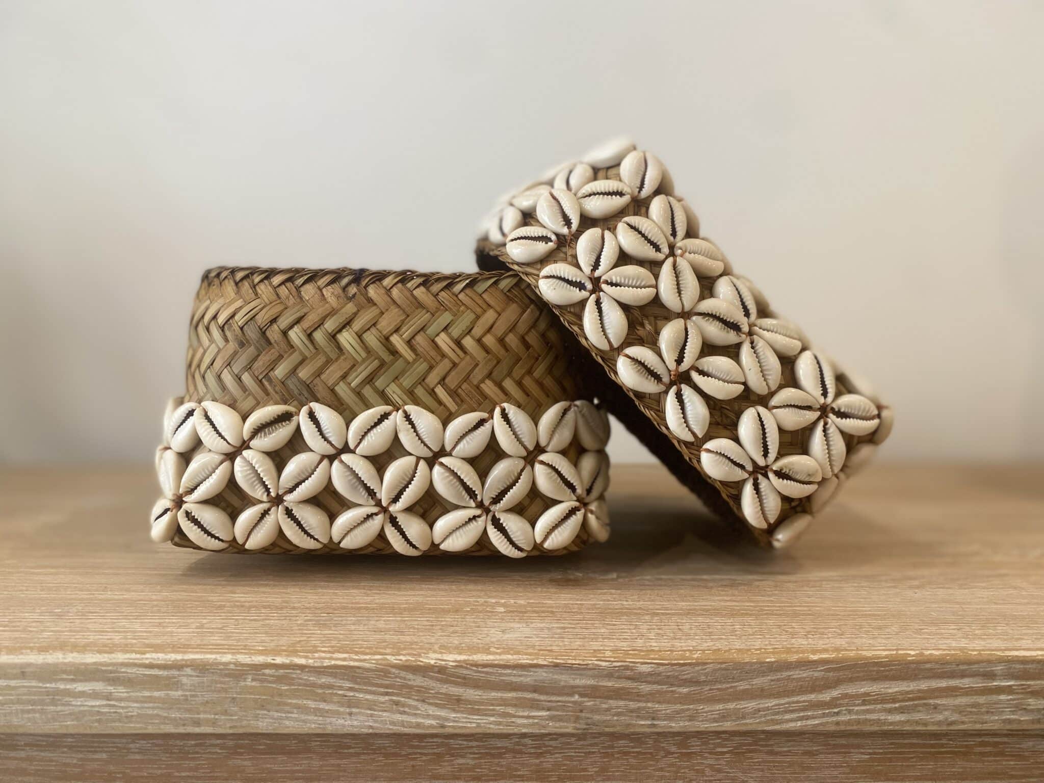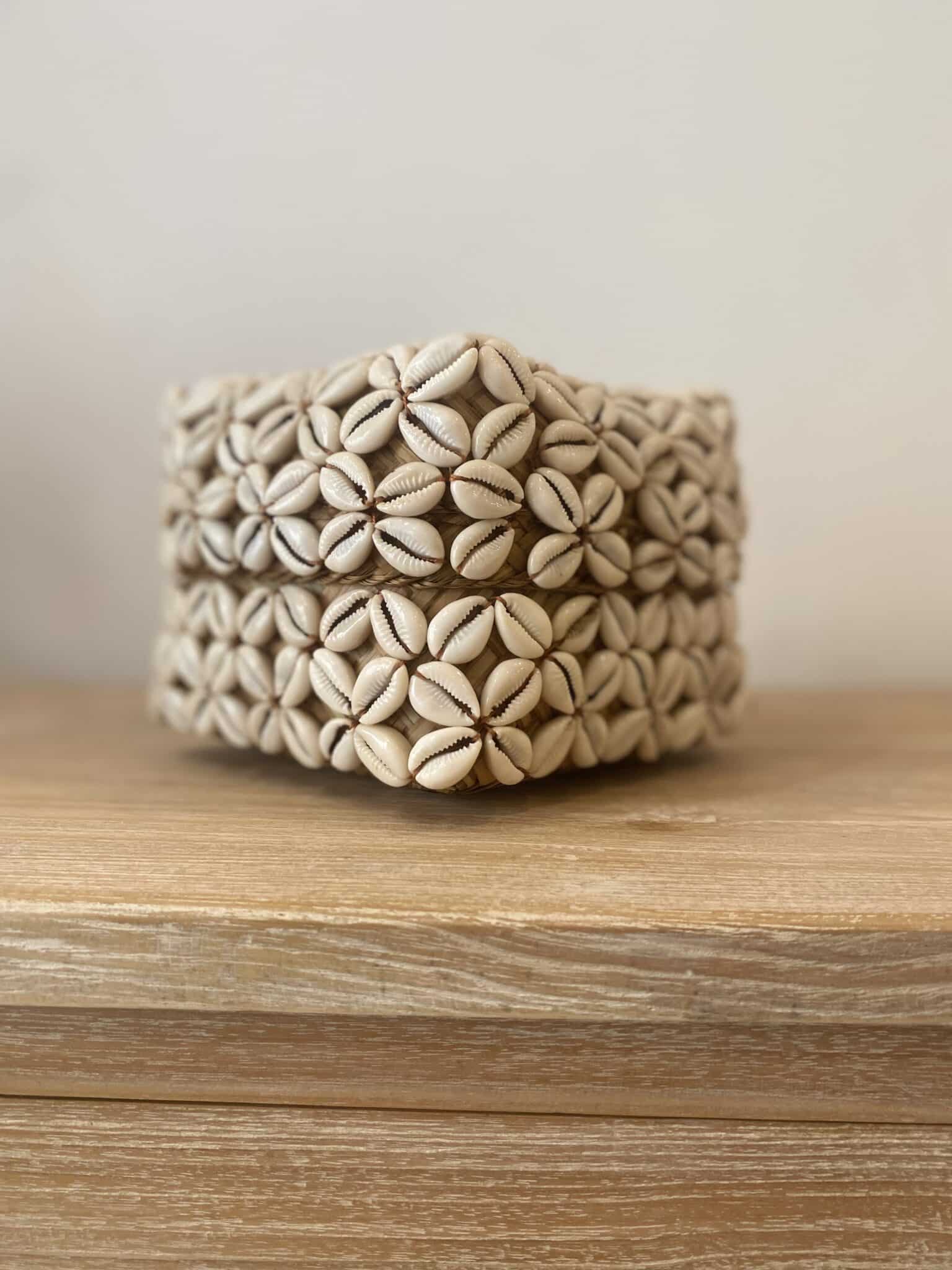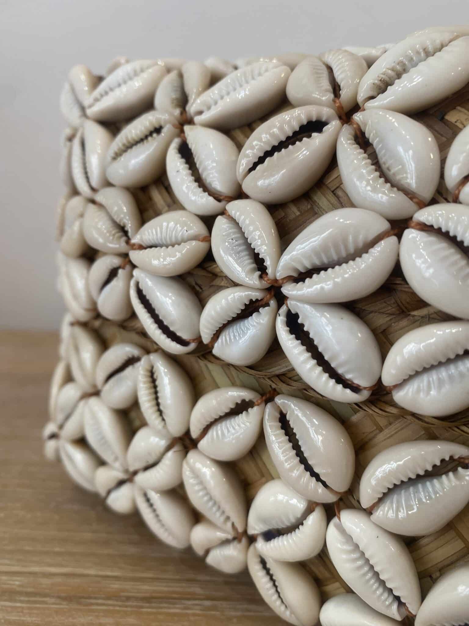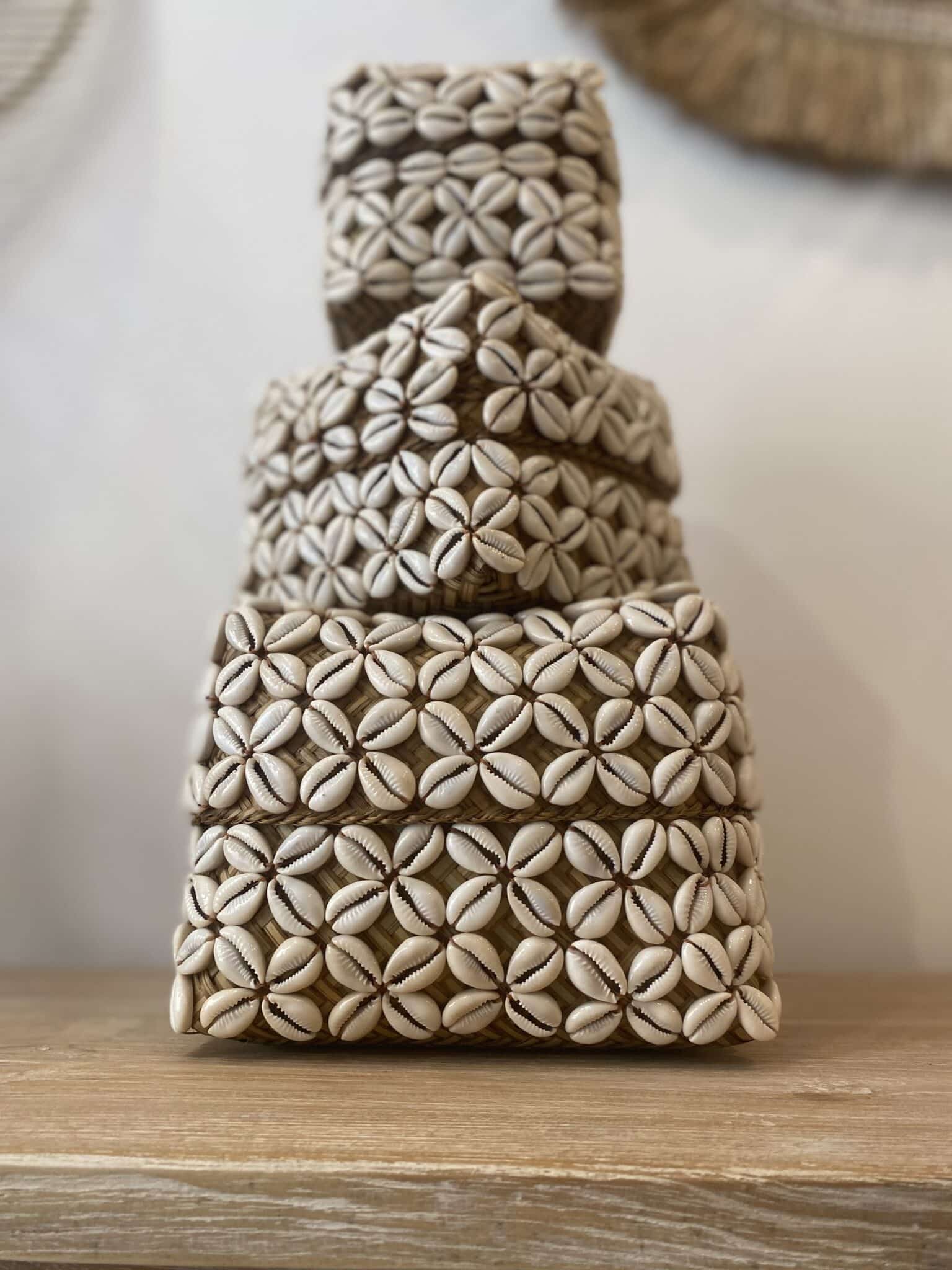 Cette boîte carrée en bambou est entièrement recouverte de coquillages cousus entre eux. Cette boîte forme un ensemble à la fois élégant et naturel.