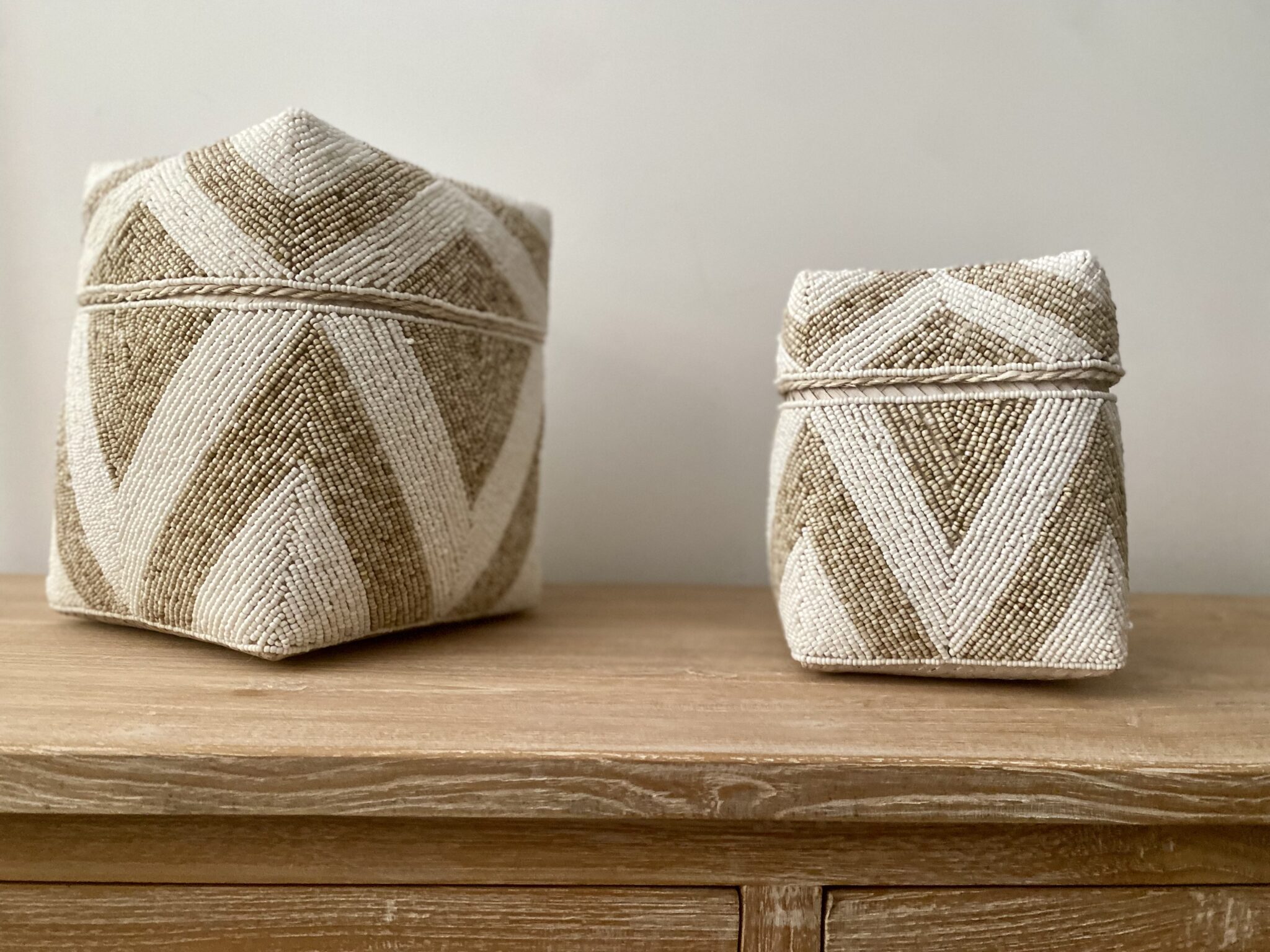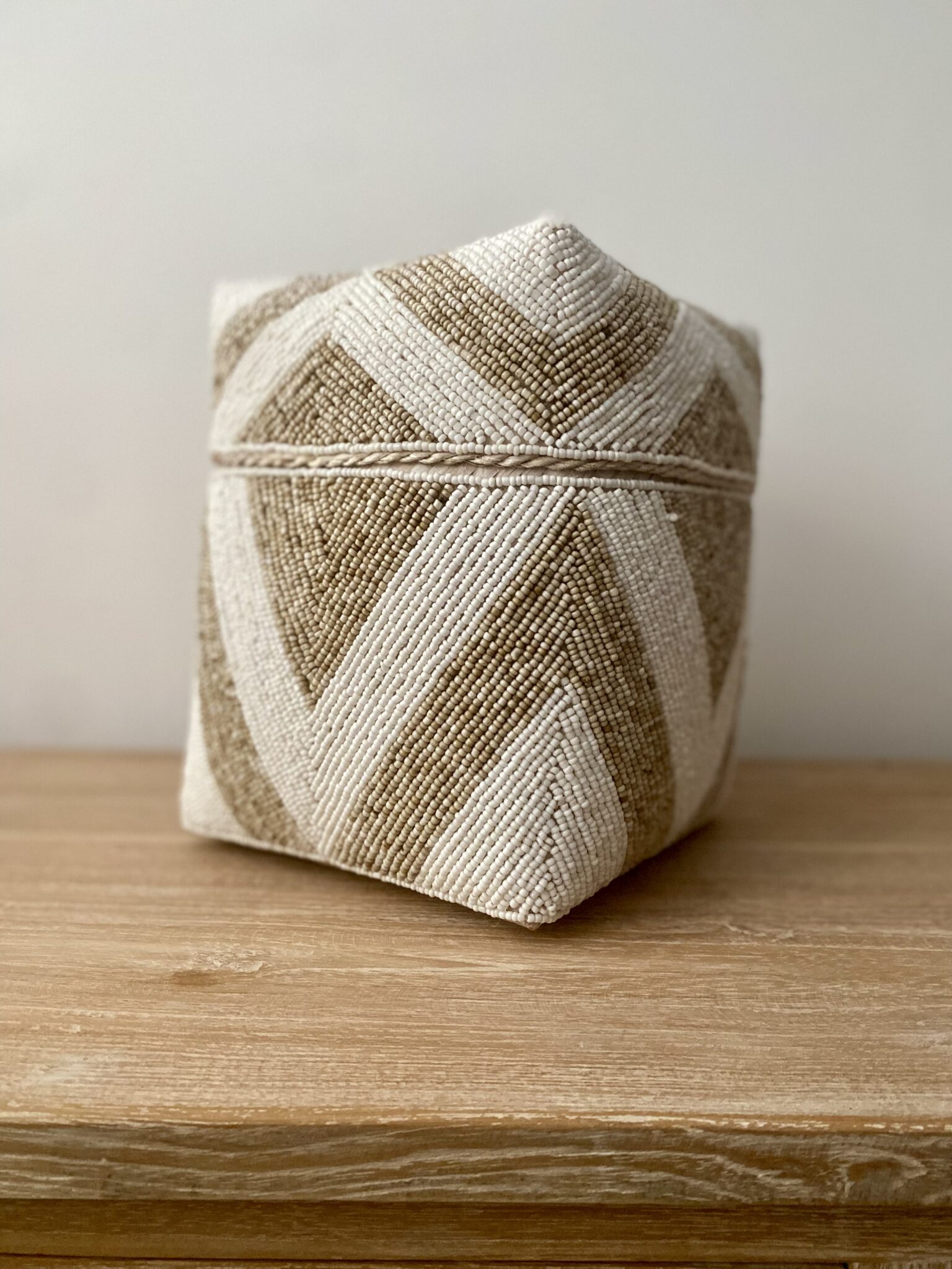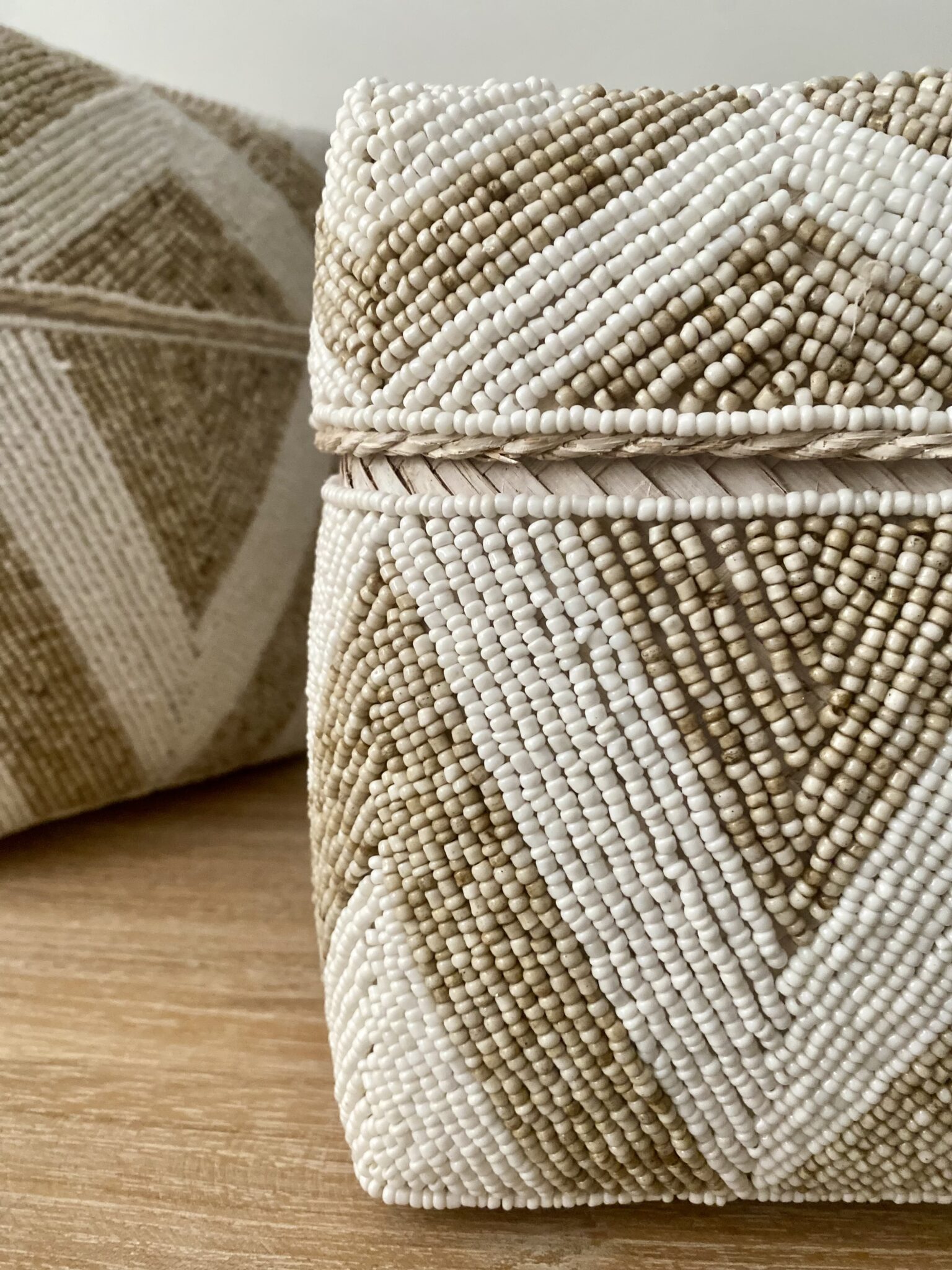 Cette boîte haute en bambou est entièrement recouverte de perles beiges et blanches pour former un joli motif sur chaque face, même sur le couvercle.