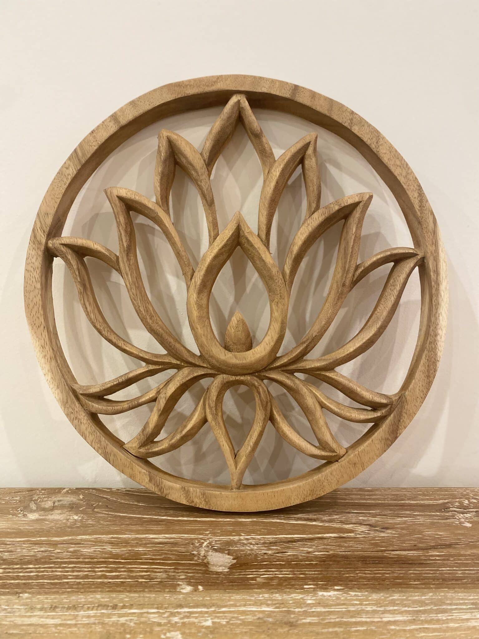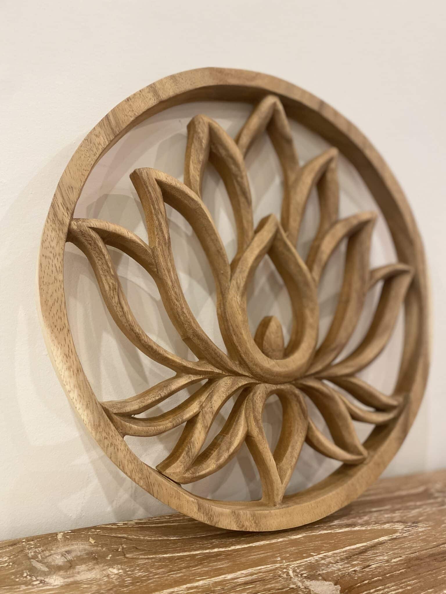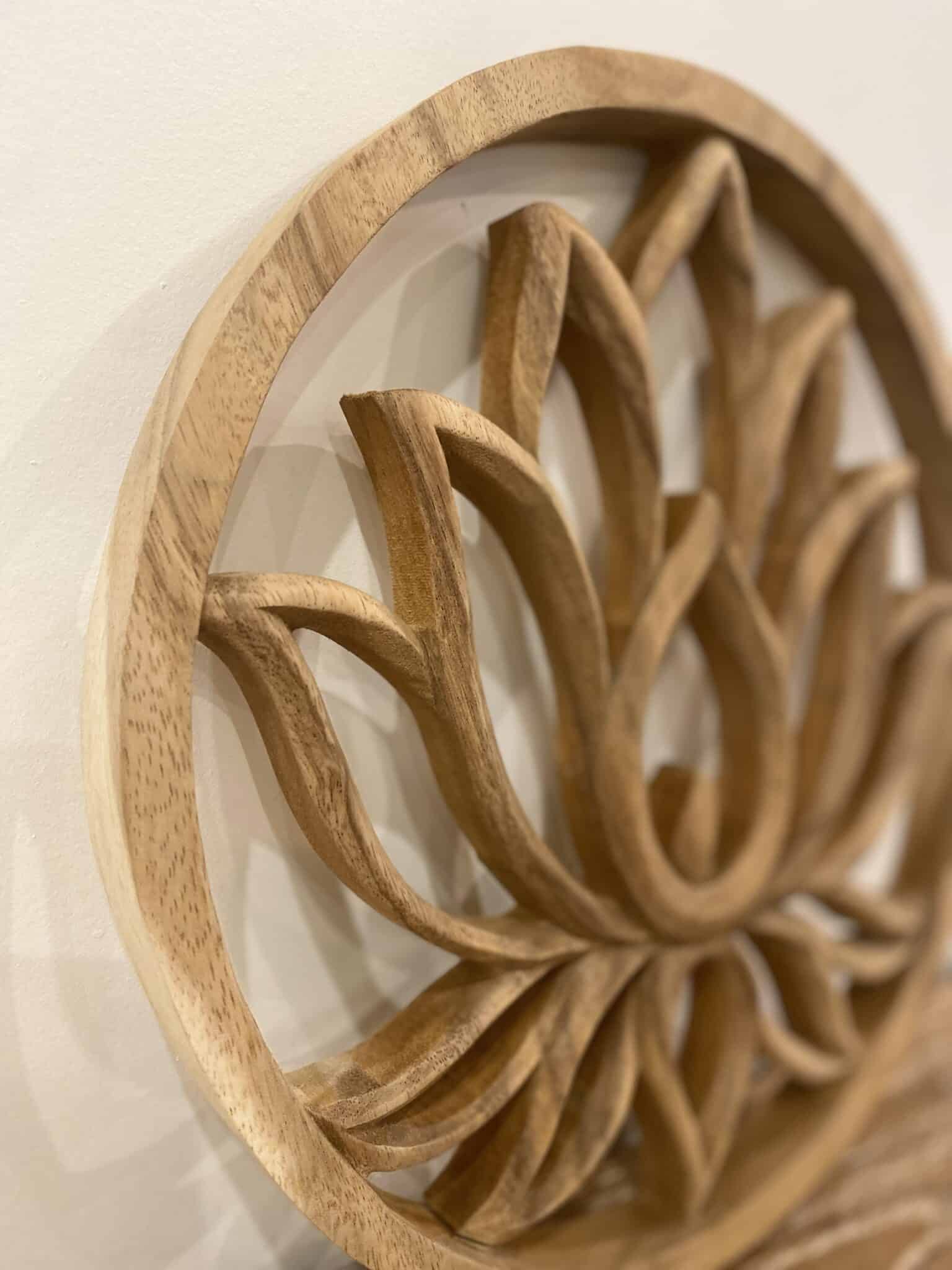Lotus en bois massif de suar, sculpté à la main, idéal sur un mur blanc. Disponible en 2 tailles, 20 et 30 cm.