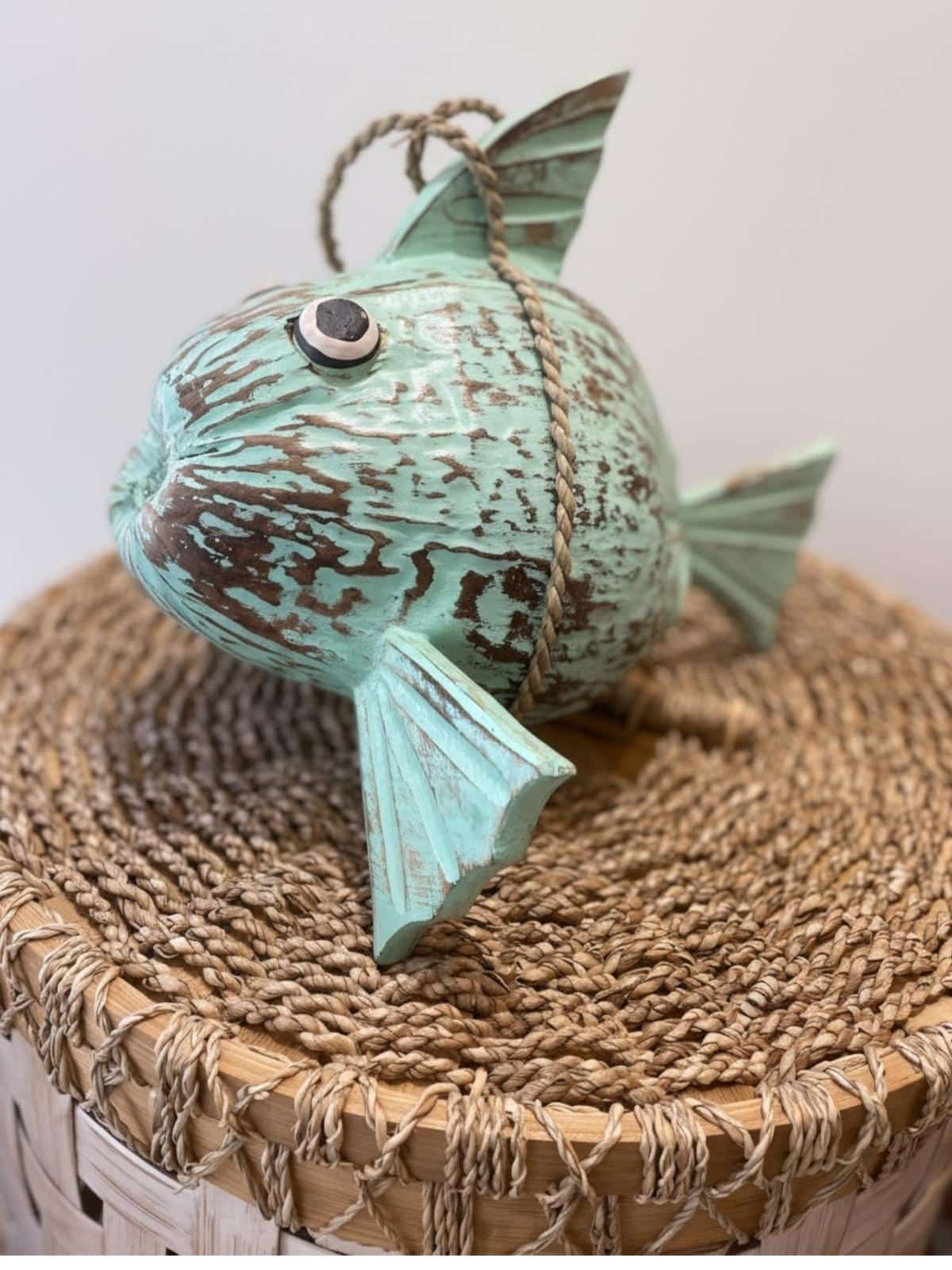 Voici une noix de coco transformée en un gros poisson lune, à suspendre ou à poser au gré de vos envies.