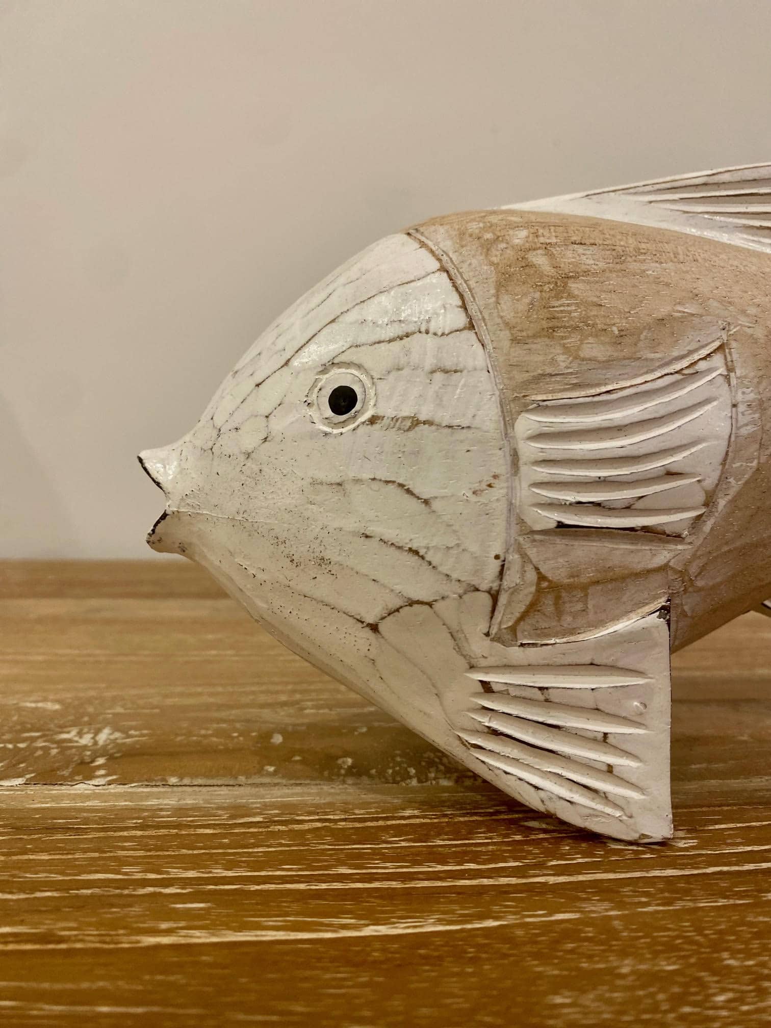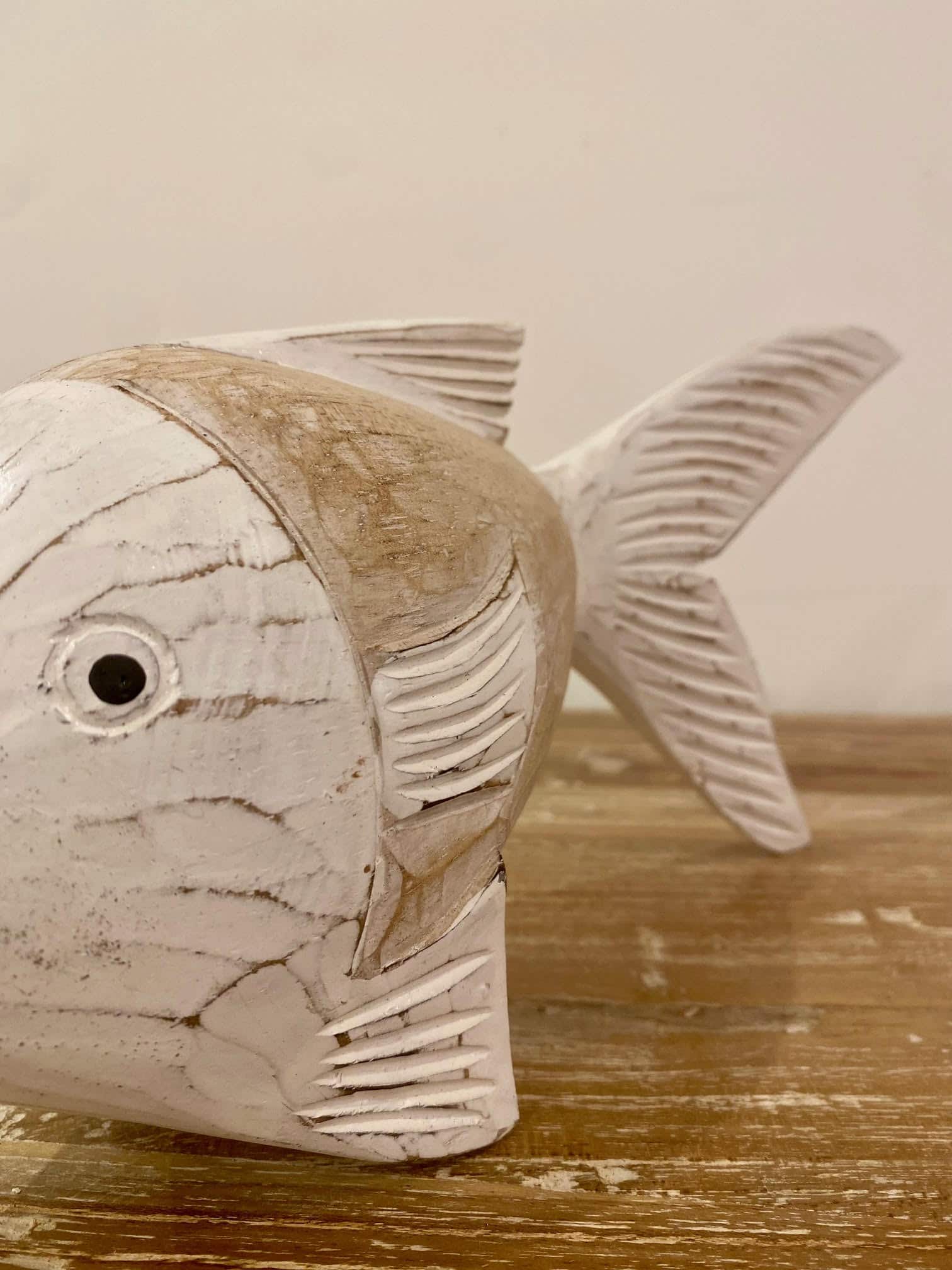 Ce poisson en bois beige et blanc dispose d’une ligne incurvée et se tient seul grâce à ses nageoires. Vous le disposerez sur une étagère ou une bibliothèque pour qu’il soit mis en valeur. Il saura vous séduire avec sa forme originale et ses douces couleurs.