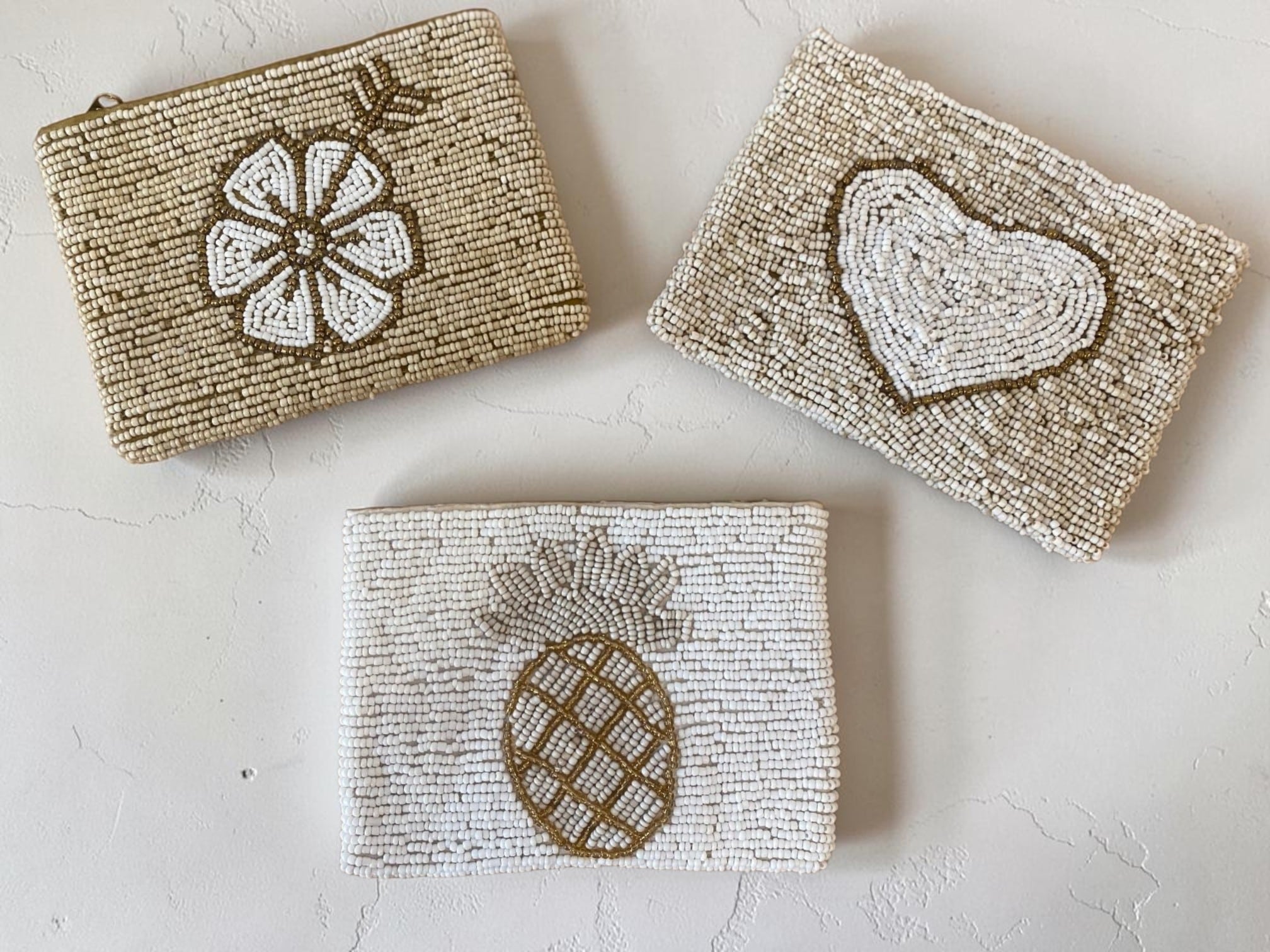 Joli porte-monnaie avec fermeture zip, entièrement recouvert de perles former un cœur, une fleur ou un ananas. Le motif est sur chaque face.