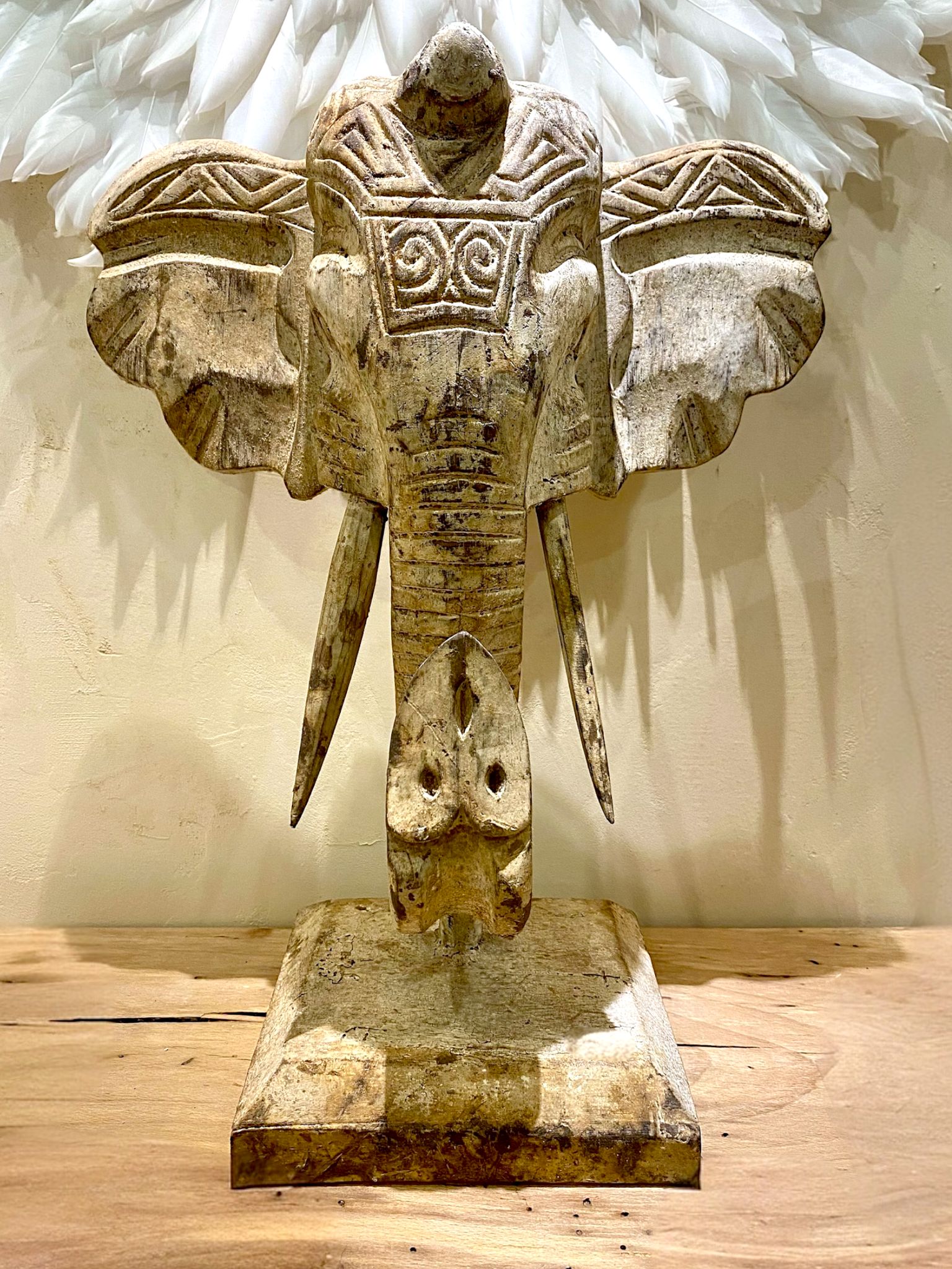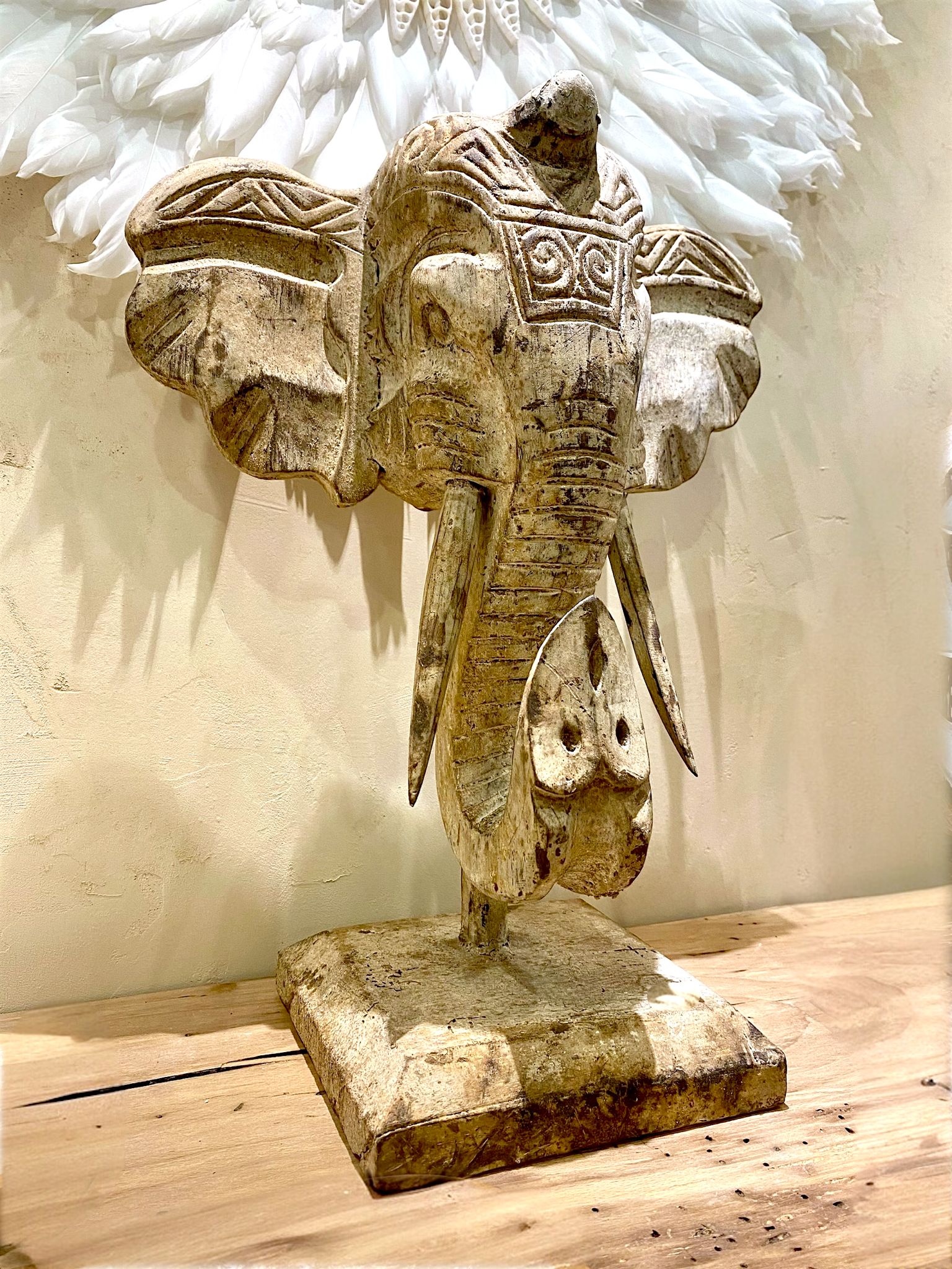 Superbe sculpture d’une tête d’éléphant en bois ancien. Deux dimensions disponibles.